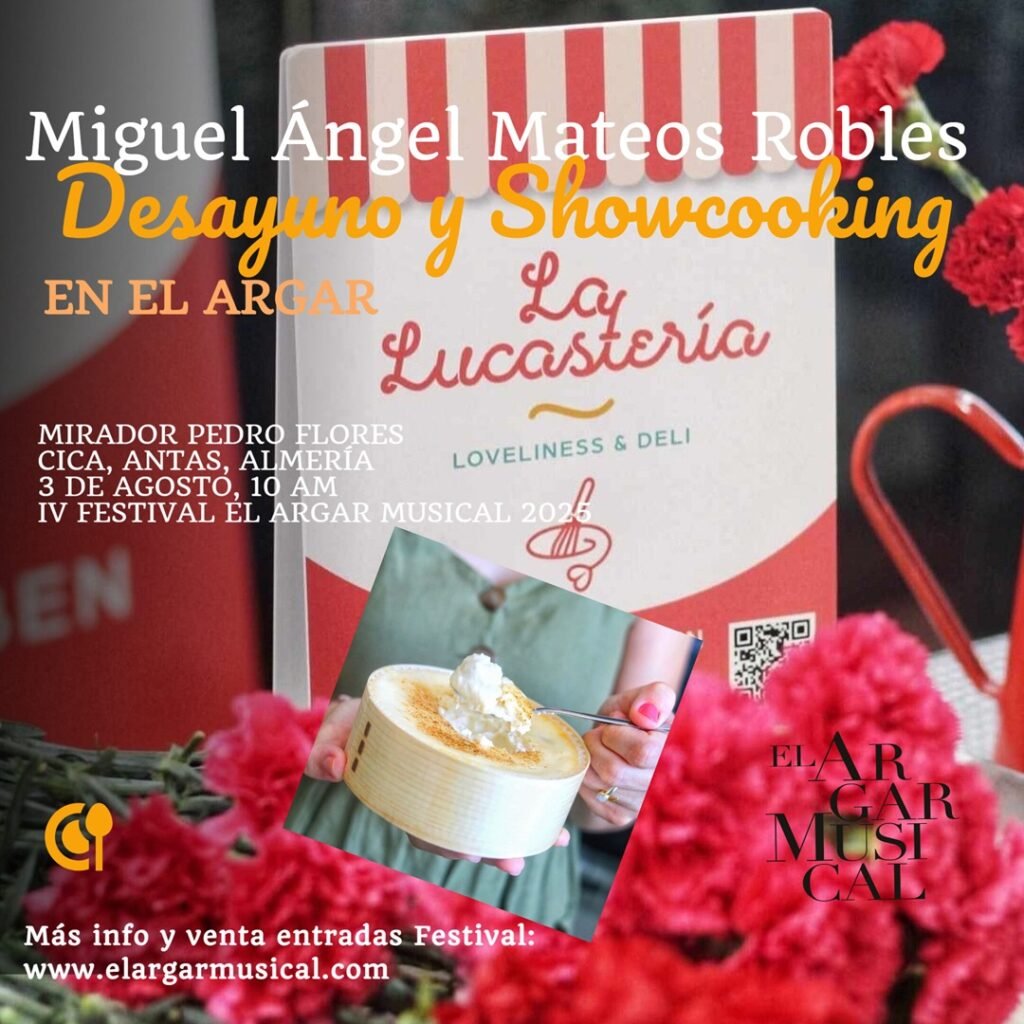 El próximo 3 de agosto desde las 10:00, vive una experiencia inolvidable en el Mirador Pedro Flores del CICA con el desayuno argárico-musical y el SHOWCOOKNG del primer Eco-Chef español, Miguel Ángel Mateos Robles. Un festín gastronómico inspirado en la cultura de El Argar que sorprenderá y deleitará los sentidos.
